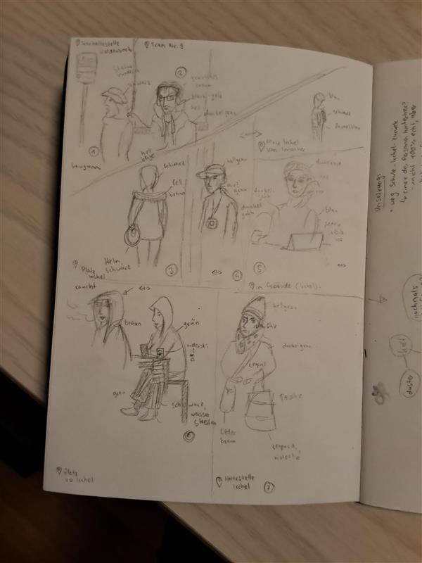 Bei der Wahl der zu zeichnenden Menschen hatte ich keine besonderen Punkte, auf die ich mich geachtet hätte, sondern habe ich vor allem die Menschen abgezeichnet, die sich dazu anboten, weil sie gerade am Sitzen waren und vielleicht sogar zu abgelenkt waren mich während dem Zeichnen wahrzunehmen. Manche Personen sind mir aber auch einfach ins Auge gestochen, woraufhin ich sie abgezeichnet habe.