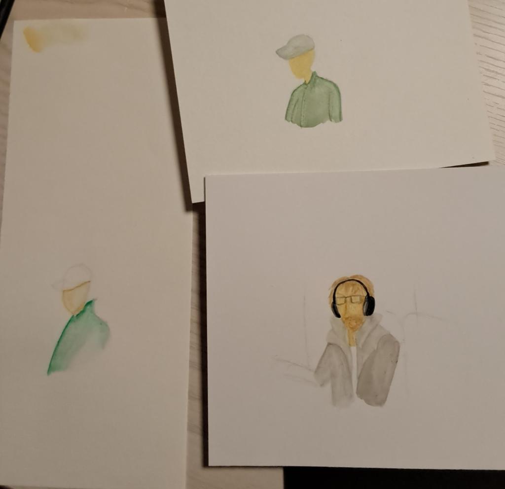 Ursprünglich waren die Skizzen kein besonders bedeutender Teil meines Projekts, da ich geplant hatte, anhand der Skizzen später Gouachebilder der Personen auszuarbeiten. Einige der Personen habe ich tatsächlich auch noch einmal mit Gouache verewigt. Das ist auch der Grund, weshalb bei den anfänglich abgezeichneten Personen Hinweise auf Farben zu erkennen sind. Grundsätzlich habe ich auch gerne mit Gouache gemalt, ich habe aber feststellen müssen, dass es mir schwerer fiel, die Gesichstsausdrücke treffend wiederzugeben. Zudem dauerte es auch länger, die einzelnen Personen mit Gouache abzumalen. Aus diesen Gründen sind die allermeisten der Skizzen in diesem Zustand geblieben.