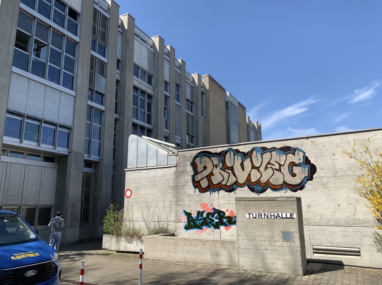 In meiner künstlerischen Arbeit erforschte ich das Thema Graffiti und das damit zusammenhängende Netzwerk. Graffiti dient nicht nur als visuelles und ästhetisches Statement in urbanen Räumen, sondern auch als soziales Signal und Kommunikationsmittel. Graffiti agiert als Netzwerk zwischen Writer*innen und den Leuten, die damit konfrontiert werden. In meinem Projekt versuchte ich die profanen Kontakte mit dieser Kunstform nachzuahmen, um die Szenen in meinem Projekt möglichst realistisch zu gestalten. Zum einen verwendete ich abstrakte, erfundene Pseudonyme, wie man sie auch auf der Strasse antrifft, um das riesige und vor allem komplexe Netzwerk von Künstler*innen darzustellen. Zum anderen nutzte ich auch sozialkritische Ausdrücke wie “Privileg“ und setzte sie in einen Kontext mit dem Ort, das Gymnasium Rämibühl. Damit kritisiere ich die Tatsache, dass nicht jeder die Möglichkeit hat, so einen Weg zu gehen. Dies sollte als ein weiteres Netzwerk interpretiert werden, ein Netzwerk des Zusammenspiels von Kritik und dem Kritisiertem. Somit sollte mein Projekt eine Sozialkritische Aussage machen, aber auch einfach die Ästhetik der Graffiti und was sie bei einer farblosen Umgebung alles bewirken kann, darstellen. Das Thema Graffiti ist noch immer sehr umstritten, doch hat sich mit der Zeit von einer illegalen Ausdrucksform zu einem festen Bestandteil der Kunstgeschichte etabliert.
