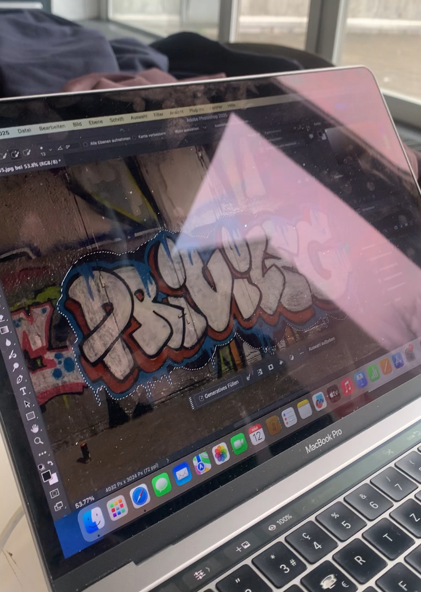 Am Anfang des Projektes versuchte ich meine Arbeit in der Schule zu machen. Dies musste ich jedoch schnell wieder ändern, da der Platz nicht ausreichend war. Somit erledigte ich den Grossteil ausserhalb der Unterrichts Zeit. In der Schule schnitt ich mit Hilfe von Photoshop die Pieces aus und editierte sie möglichst realistisch auf die Fassaden des Rämibühls. Zunächst hatte ich beim Ausschneiden Schwierigkeiten da ich vorher noch nie mit Photoshop gearbeitet habe, doch mit hilfe von Tutorials schaffte ich dies auch. Während meiner Arbeit, versuchte ich möglichst viele Styles und Techniken zu verwenden, um das Gefühl es wären viele verschiedene Writer*innen gewesen, zu vermitteln. Bei den Styles tastete ich mich von Bubble, zu Blockschrift und versuchte sogar Wildstyle. Ich arbeitete mit verschiedenen Dosen wie highpressure und lowpressure Dosen. Auch mit unterschiedlichen Caps experimentierte ich sehr viel. Ausserdem versuchte ich neue Techniken zu etablieren, indem ich einen Tag machte und ihn zu einem Graffiti verwandelte.